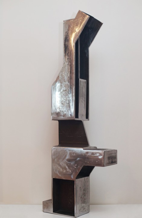 My journey to you has led me to stillness My journey to you has led me to stillness From motion graphics to working with mild steel, 'my journey to you has led me to stillness' is a work that expresses Battaglia's own journey through art disciplines. Derivative of an animated mechanical form, the work captures time flow in motion. The objects tactile machinations visible through its exposed parts and flow between the mechanical and cup like vessel to its side.
